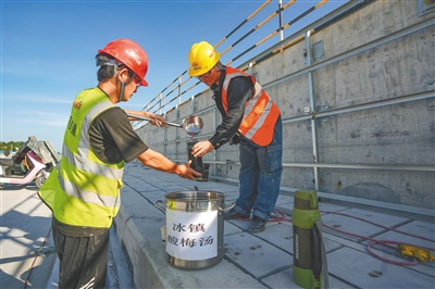 日前,在位于三亚崖州湾科技城的G98环岛高速公路三亚改建工程施工现场,工人们头顶烈日安装模板。