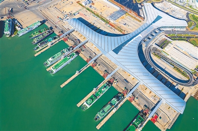 7月6日,俯瞰即将建成投用的海口新海港综合交通枢纽站项目。该项目集港口候船、登离船、口岸查验、枢纽商业和交通“零换乘”等功能于一体,是全国最大港口客滚综合枢纽,在提升海口新海港服务水平,辐射带动周边旅游、文化和商业配套服务发展的同时,也将成为海南自贸港全岛封关运作的重要口岸设施支撑。本报记者 袁琛 摄