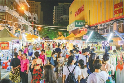 三亚红旗街夜市里,市民游客前来逛街购物,享受清凉夏夜的惬意。