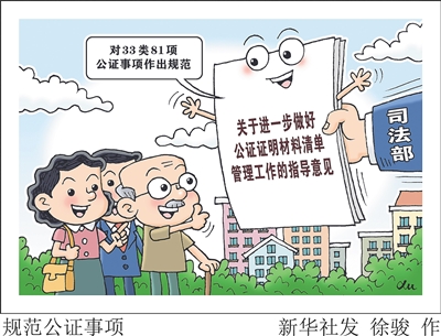 新华社北京7月6日电 (记者白阳)司法部日前向社会公布《关于进一步做好公证证明材料清单管理工作的指导意见》,对33类81项公证事项作出规范。指导意见坚持减证便民原则,明确能够通过政务信息资源共享方式获取的,不再让当事人提供;坚决清理不必要的证明材料。