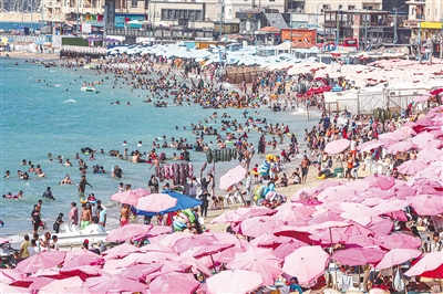 七月六日,人们在埃及亚历山大的海边游玩消暑。 新华社发