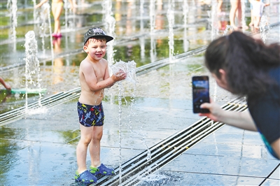 7月6日,在俄罗斯莫斯科,儿童在喷泉中玩耍消暑。新华社发
