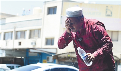 7月6日,一名男子在科威特首都省为自己泼水降温。新华社发
