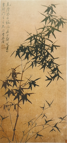 其《竹图》立轴,纸本设色,纵125厘米,横54.5厘米,创作于1753年,现收藏于南京博物院。画上竹竿纤细,却瘦硬坚劲;竹叶肥硕,墨色浓淡分明,这正体现了郑板桥画竹“瘦竿肥叶”的特点。竹竿、竹节、竹叶,笔笔得法、得神,一枝一节一叶惟妙惟肖,给人以无限美的享受。