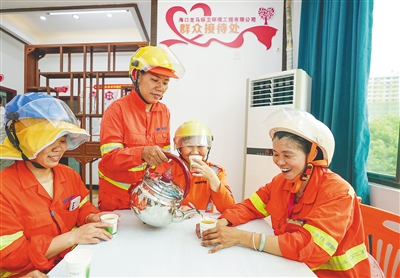 7月9日,在海口市龙华区金牛路的户外劳动者服务站点,环卫工人喝凉茶消暑解渴。炎炎夏日,为预防环卫工人户外作业中暑,海口各环卫公司组织管理人员和后勤保障人员制作绿豆汤、凉茶,为坚守一线的环卫工人送上清凉。本报记者 李天平 摄