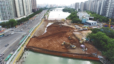 在海甸溪施工段,施工车辆正在进行围堰内部土方回填作业。(图片均由项目建设方供图)