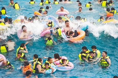 7月8日,游客在安徽省芜湖市南陵县大浦乡村世界的海啸馆戏水游玩。新华社发(肖本祥 摄)