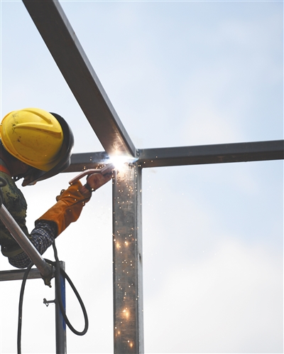 连日来,广州遭遇持续高温天气。为了应对高温天气,工地调整作息时间,施工时间避开中午高温时段。图为工人进行焊接作业。新华社发