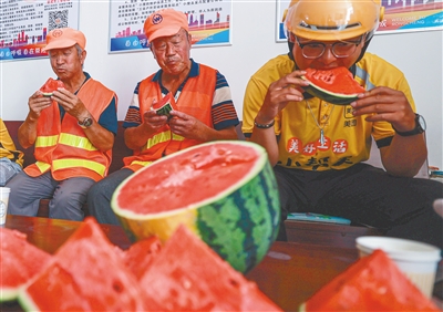 日前,山东省荣成市环卫工人、外卖配送员在休息时吃西瓜解暑。新华社发