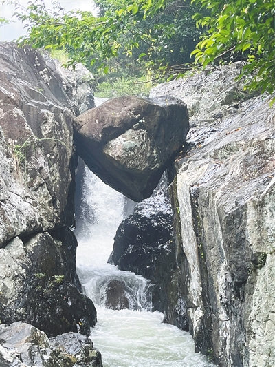 这条瀑布还有一个奇特之处:一块巨石恰好卡在两壁之间,从下往上看,巨石、岩壁、银瀑等共同勾勒出一种险峻之美。此外,这条瀑布很“亲民”,它的落差仅有三四米,在做好安全防护的前提下,游客可以踩着两边的石头攀到瀑布顶部,从另一个角度观赏。