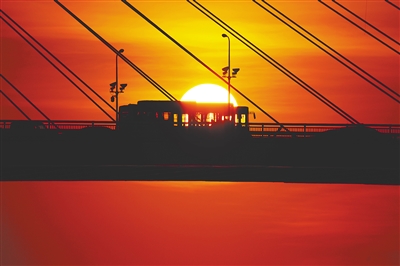 6月7日,海口世纪大桥的落日染红了整片天空。 唐域博 摄