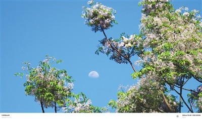 6月9日上午,在海口市南渡江东岸,透过苦楝树的枝头和花朵,相机捕捉到月亮悬在湛蓝天空中的景观。 蒋大武 摄