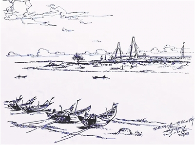 海口世纪大桥建成通车前的渔舟停泊景象。王宁光绘