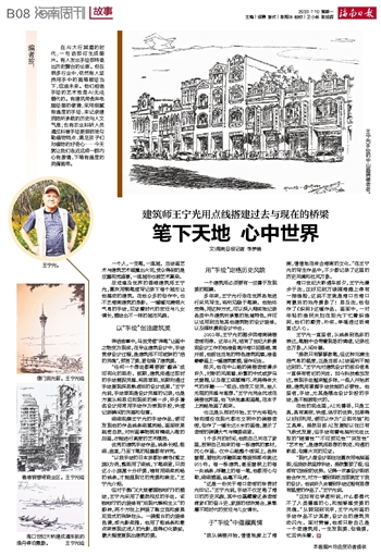 足迹遍及世界的香港建筑师王宁光,喜欢用钢笔速写记录下每个城市让他感动的建筑。在他众多的创作中,也不乏海南建筑的身影。一幅幅充满烟火气息的手绘,见证着时代的变迁与儿女情长,描绘出不一样的城市风貌。