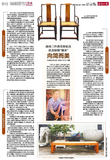 文\海南日报记者 刘梦晓 实习生 梁菁今年6月,在第十九届中国(深圳)国际文化产业博览交易会落下帷幕之际,大会“中国工艺美术文化创意大赛”的名单也随之出炉。海南三件黄花梨家具作品出现在榜单上:《黄花梨藤面高靠背南官帽椅》获得金奖;《黄花梨藤面马蹄足榻》获得银奖;《黄花梨螭龙纹独板南官帽椅》获得铜奖。