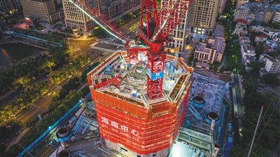 海南中心项目昼夜不停紧抓施工,实现节节拔高。上半年已完成核心筒17层结构施工,东、西配楼均实现提前封顶。下半年,西配楼展示中心将全面完成精装修并对外展示,核心筒、外框架工程进度进一步提速,不断突破项目建设新高度,确保达成全年工期目标。