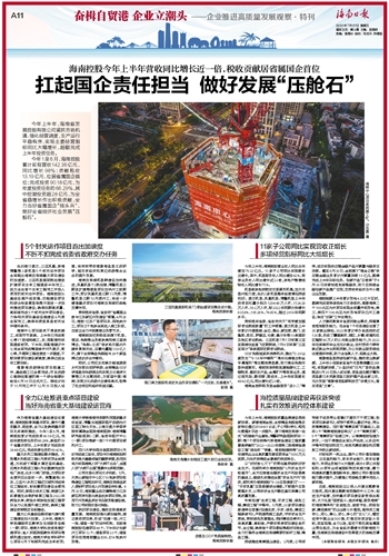 今年上半年,海南省发展控股有限公司紧抓市场机遇,强化经营调度,生产运行平稳有序,实现主要经营指标同比大幅增长,超额完成上半年投资任务。今年1至6月,海南控股累计实现营收142.36亿元,同比增长98%;贡献税收13.19亿元,位居省属国企首位;完成投资90.18亿元,为年度投资任务的66.29%,其中挖潜投资超28亿元,为全省稳增长作出积极贡献,全力当好省属国企“排头兵”,做好全省经济社会发展“压舱石”。