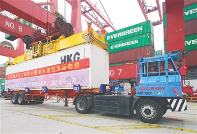 7月20日,集卡在宁波舟山港运输到港的中国香港代表团竞赛物资。