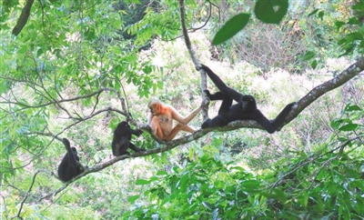 海南长臂猿是海南岛真正的“原住民”,三亚落笔洞遗址就曾发现一万多年前的长臂猿化石。海南长臂猿是海南热带雨林的旗舰物种,仅分布在海南热带雨林国家公园霸王岭片区。它是全球最稀有的灵长类动物,濒危程度远高于大熊猫。得益于海南热带雨林国家公园的建设,海南长臂猿的种群和数量得到有效恢复。
