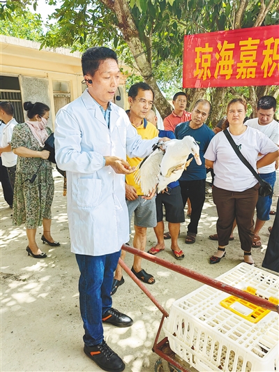 在做好嘉积鸭品种保护和育种工作之余,他还不时走进琼海当地农户的鸭圈,推广传授嘉积鸭管理饲养新技术,帮助农户解决实际问题。