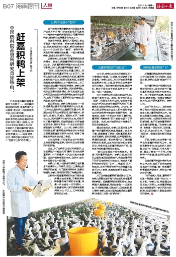 来自中国热带农业科学院热带作物品种资源研究所的研究员(博士)徐铁山,自2004年来到海南工作以来,长期致力于推动嘉积鸭“提纯复壮”,并筛选出适合嘉积鸭的饲养模式——网床饲养。近日,海南日报记者采访了这个“赶鸭子上架”的农博士。