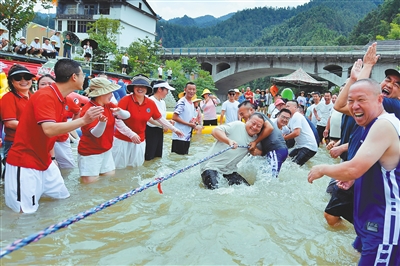 盛夏时节,湖北省恩施土家族苗族自治州宣恩县高罗镇板寮村举行一场以“水上排球”“水上拔河”“水桶接力”“水上呼啦圈”等为内容的趣味水上运动会,吸引全镇各村组队参与。村民们在溪水中参与趣味运动,乐享清凉。新华社发