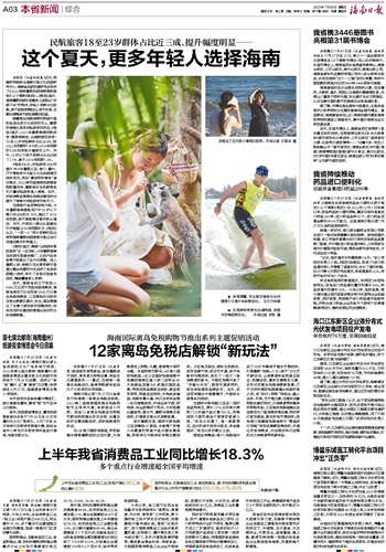 本报海口7月27日讯 (记者邵长春 通讯员冯曦 侯金赋)海南日报记者7月27日从省工业和信息化厅获悉,今年上半年,全省消费品工业(轻工业)实现产值达489亿元,同比增长18.3%,多个重点行业增速超过全国平均增速,延续一季度开门红良好增长态势。医药制造业、农副食品加工业、食品制造业、酒、饮料和精制茶制造业等重点行业上半年产值增速分别达18.1%、15.6%、14.2%、98.3%。