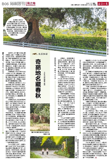 文\本刊特约撰稿 杨树在海南,有的村庄靠山而建,即以山命名,有的村庄靠水而建,则以水命名,但还有一些奇葩、独特的村名,似乎是剑走偏锋、无中生有。事实果真如此吗?这些地名的由来,同样有迹可循。追溯村名渊源,可见村庄深藏的故事,可见村名深藏的内涵。