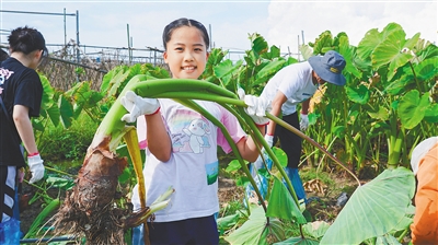 在龙泉镇五一村,小朋友拿起工具,到田间采挖芋头,感受劳动的快乐。