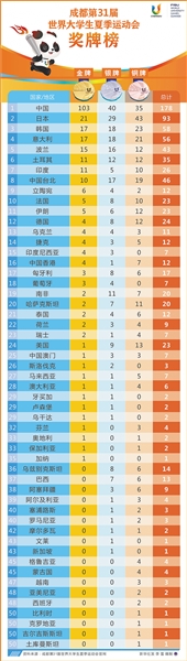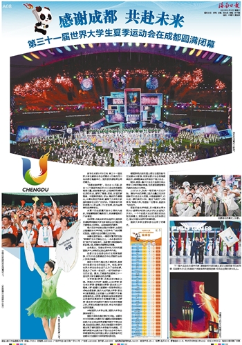 新华社成都8月8日电 第三十一届世界大学生夏季运动会闭幕式8日晚在四川省成都市隆重举行。国务委员谌贻琴出席闭幕式。“成都成就梦想”。在过去12天里,来自113个国家和地区的6500名运动员展现青春力量,绽放青春光彩,以饱满的热情和优异的状态,谱写了青春、团结、友谊的新篇章。中国秉持简约、安全、精彩的办赛理念,认真兑现庄严承诺,赢得了大体联大家庭和国际社会的广泛好评。中国体育代表团获得103枚金牌、178枚奖牌,名列金牌榜和奖牌榜首位。