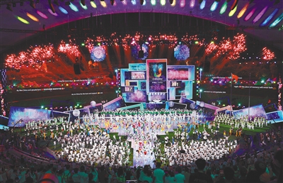 焰火在空中绽放出倒计时数字,全场观众随着数字齐声呼喊,“太阳神鸟”飞临闭幕式现场。成都大运会闭幕式正式开始。
