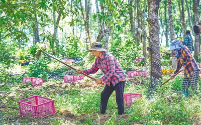 8月9日,白沙黎族自治县牙叉镇南仲六队种植基地,村民在橡胶林下采挖虎奶菇。
