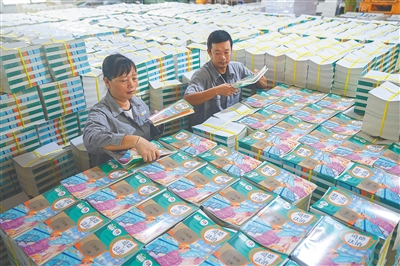 图为8月9日,出版发行人员打包教材。图/文 本报记者 袁琛 实习生 张赫宇