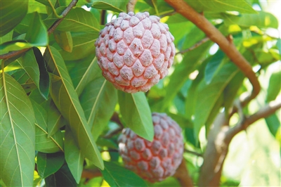 本报讯 (记者李艳玫)近日,走进育才生态区那受村种植基地,果香四溢,悬挂在枝头的紫红色果子引发大家的好奇,访客一拨接着一拨。“那受村2021年引进紫色释迦热带果树,建立10亩紫色释迦种植示范基地,经过两年的努力,紫色释迦挂果啦。”那受村驻村第一书记、乡村振兴工作队队长肖春雷自豪地介绍道。据了解,释迦被誉为“热带果王”,果实以清甜而深受消费者喜欢。紫色释迦,带有淡淡的玫瑰香味,又称玫瑰释迦,是一种稀缺的品种。一般要种植3年左右才能挂果,且一棵树一年只能结8颗至15颗紫色释迦,更显珍贵。