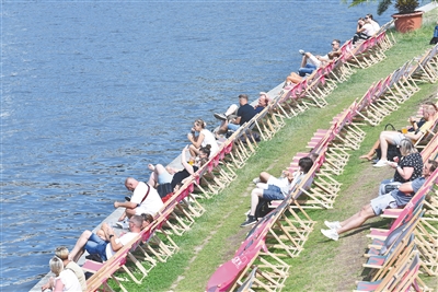 炎热天气下,人们在德国柏林施普雷河畔休闲。