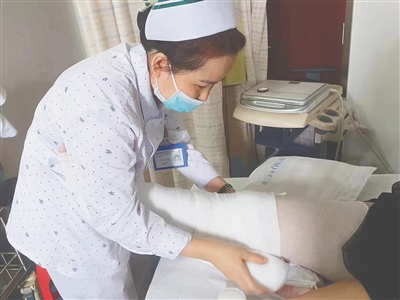 护士为患者腿部包扎低弹性压力绷带。医院供图