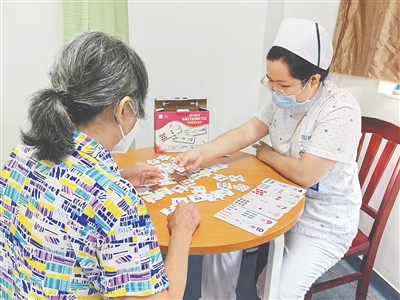 “医护陪着做题、玩游戏,把老人当成孩童来护理、治疗,老爸整个人好像又变聪明了点。”近日,中重度阿尔茨海默病患者陈老伯的儿子对今年6月海医二附院新开设的认知功能训练护理门诊有了新认识。