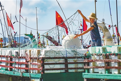 ② 8月16日,在三亚崖州中心渔港,渔民整理渔网,准备出海捕鱼。本报记者 王程龙 摄