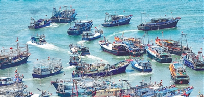 8月16日一大早,琼海市潭门中心渔港码头熙熙攘攘。船老大李献忠带着4名船员忙碌起来,把成箱的饮用水、大米、耐保存的蔬菜等各类生活生产物资往船上送。8时不到,由琼海市渔政事务服务中心、海岸警察、海洋与渔业行政执法大队组合而成的联合执法队,准时出现在渔港码头,对申报出海的渔船进行安全隐患排查。当天,琼海市超40艘渔船起航。