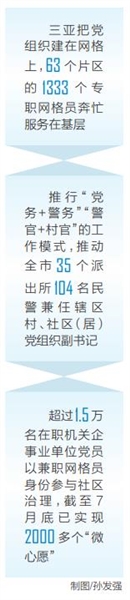 目前,三亚已在全市成立29个党建联席会议、25个党建联盟、20个社区“大党委” ,基层组织体系从“树状”向“网状”拓展,有效把区域内党组织广泛联起来、兜底管起来。同时,该市深化“一张网、全覆盖、心连心”基层党建网格化管理模式,把党组织建在网格上,63个片区的1333个专职网格员奔忙服务在基层。