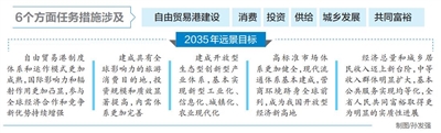 围绕发展目标,《行动方案》提出6个方面任务措施,分别涉及自由贸易港建设、消费、投资、供给、城乡发展与共同富裕。
