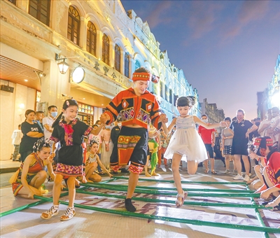 市民游客在海口骑楼老街体验跳竹竿舞。