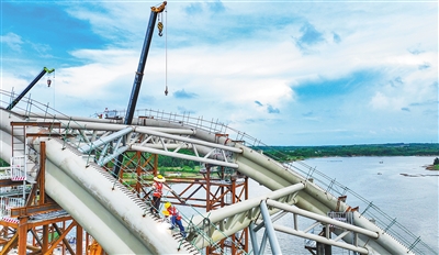 “8月20日晚,3台混凝土运输罐车来回运转,1台大型天泵伸出46米长的‘手臂’,将搅拌好的混凝土源源不断浇筑在中跨箱梁上。”张圣贤说,合龙段长2米,顶宽18米,他和同事们足足奋战了3小时,把超26立方米混凝土浇筑在规定区域。