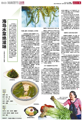 文\海南日报记者 张期望在很多人印象中,蔬菜都生长于田间地头。其实不然,据统计,我国市面上的淡水蔬菜有13种,海水蔬菜也有约10种。以四面环海的海南岛为例,清澈的海水不仅孕育了名贵的海葡萄,也孕育了价格相对实惠的海带、裙带菜等。与此同时,海南居民也在水田、池塘等处种植水芹、蕹菜、莲藕等淡水蔬菜。其中蕹菜、莲藕已大面积种植,是百姓餐桌上的常客。