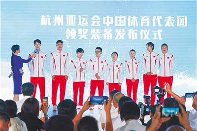 8月24日,运动员代表展示杭州亚运会中国体育代表团领奖服装。 新华社发