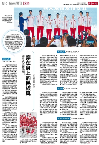 纵观历届奥运会、亚运会中国体育代表团礼服、领奖服,及历届全运会海南体育代表团礼服,可以看到时代变迁和科技进步带来的变化,也能看到内涵丰富的民族传统文化。