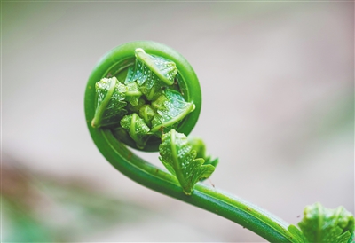 蕨类植物的幼叶由卷曲逐渐伸展开,叶脉将支撑起叶片的形状。