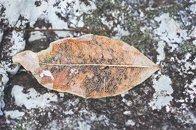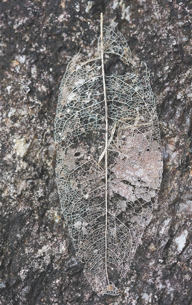 自然界中不缺少美,而是缺少发现美的眼睛。记者曾有幸在海南黎母山热带雨林的天然石臼中,发现了叶肉自然分解后留下的较为完整的叶脉。石臼中的小水坑积攒了一些树叶,在水的浸泡中,这些树叶没有像枯叶那样卷曲变形。整片叶子的叶肉经过均匀分解后,纵横交错的叶脉清晰可见,让人对这天然的艺术作品不禁心生赞叹。