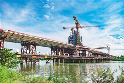 据悉,目前大桥建设进度已达80%,为明年初实现功能性通车打好了基础。据介绍,乐城大桥是海南首座自锚式悬索桥,也是海南重点建设项目和乐城先行区重点基础配套工程。大桥全长1.757公里,通车后从乐城先行区驱车到琼海市区仅需10分钟。特约记者 蒙钟德 摄