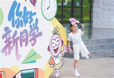 ① 8月29日,刚入学的长滨小学一年级新生在欢迎展板上拍照留念。 本报记者 封烁 摄